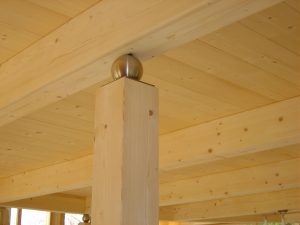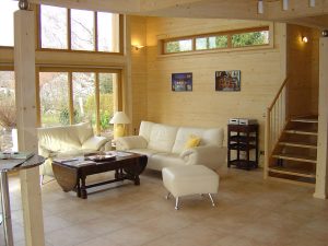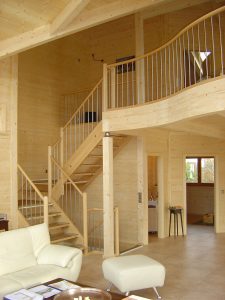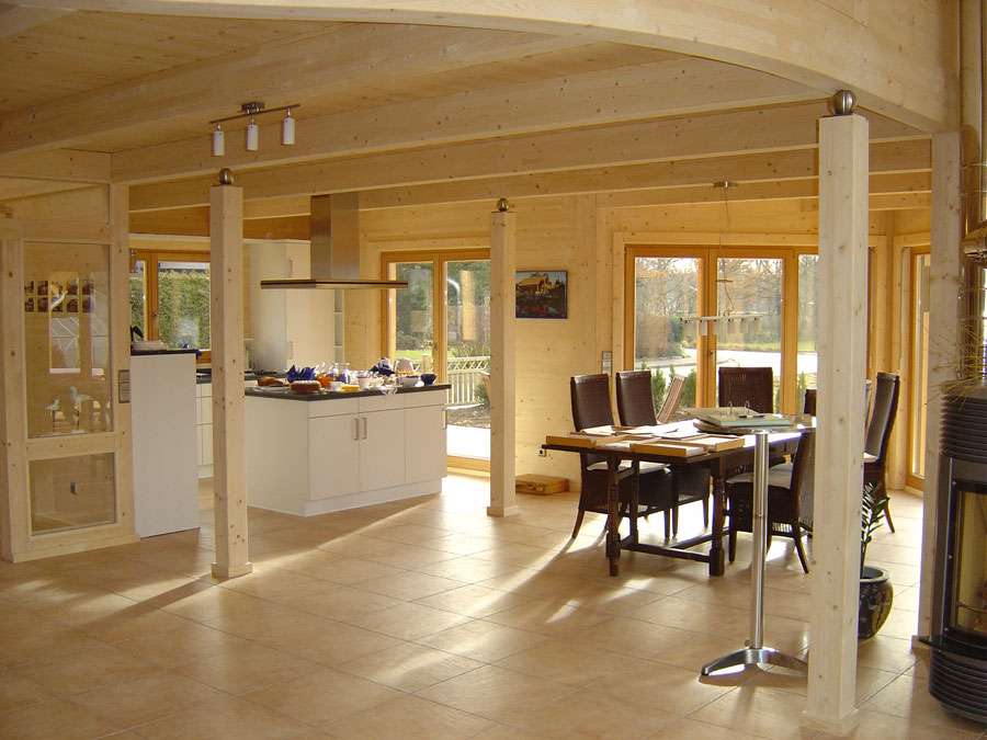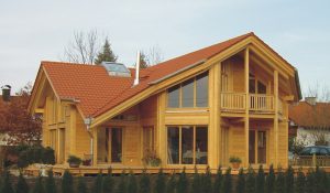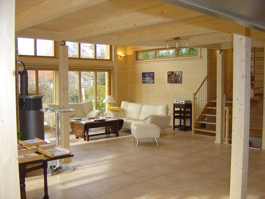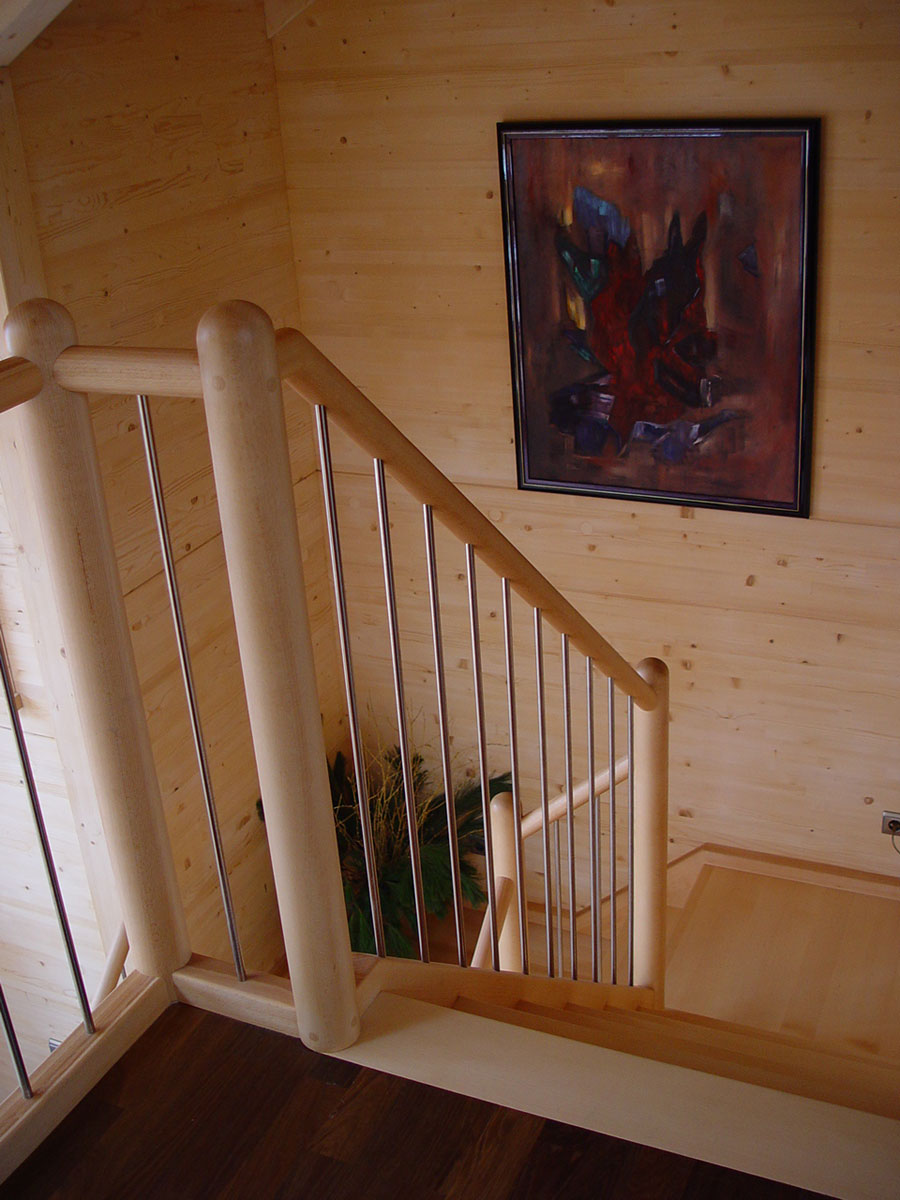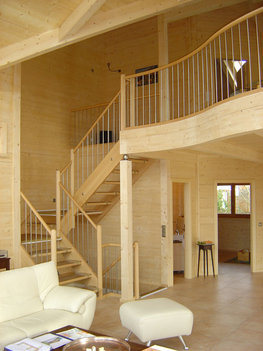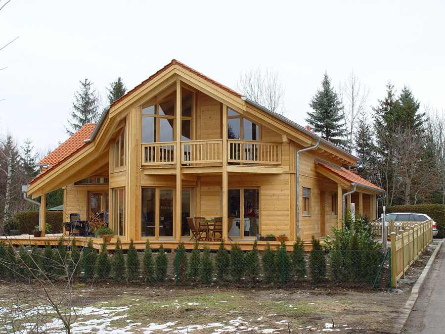 U predgrađu Münchena uz zeleni se pojas nalazi obiteljska kuća nekonvencionalne tlocrtne osnove. Središnji boravišni dio je svijetao i prozračan dvoetažni prostor sa staklenom ovojnicom unutar koje se isprepliću galerija, dnevna soba i blagovaonica. Osnovna ideja prostornog koncepta je preplitanje etaža koje se vidi i na vanjskom dijelu objekta, gdje se motiv ponavlja na drvenoj terasi s drvenim balkonom oslonjenim na stupove. Fasadna je opna u cijelosti napravljena od ariša.