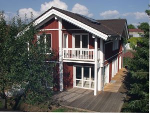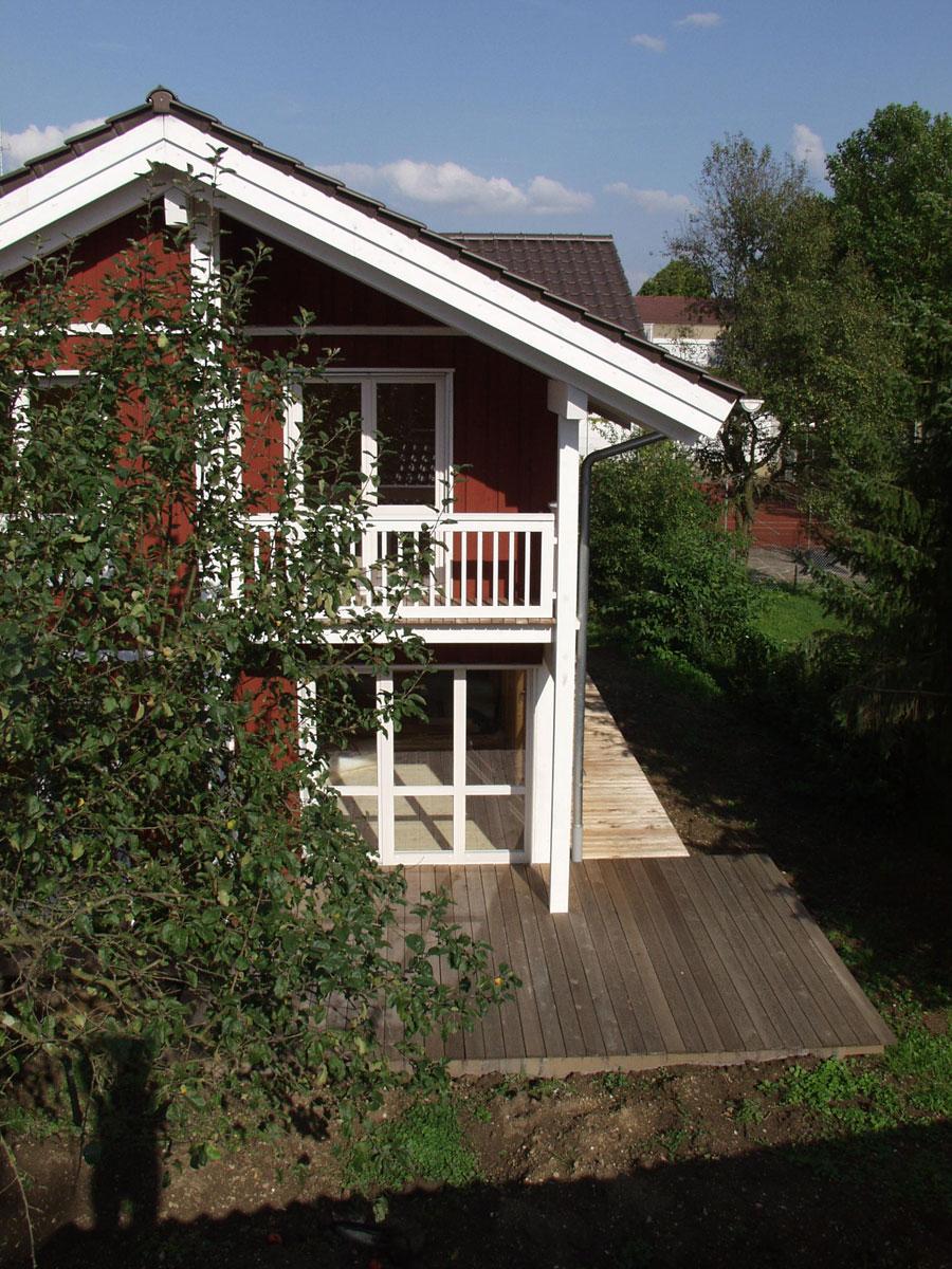 U okolici Münchena u predjelu s obiteljskim kućama ističe se objekt s drvenom fasadom, koja je u potpunosti prekrivena crvenom bojom. Različiti elementi boja stvaraju zanimljiv grafički prikaz vertikalne i horizontalne podjele kuće: bijela boja na crvenoj podlozi ističe etaže, stupove, krovni vijenac i prozorske okvire. Velika drvena terasa u prirodnom tonu je ishodište i most koji povezuje izgrađenu strukturu i prirodu koja je okružuje.