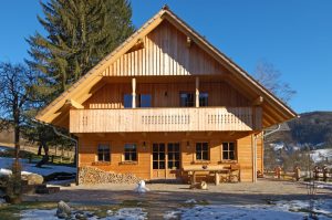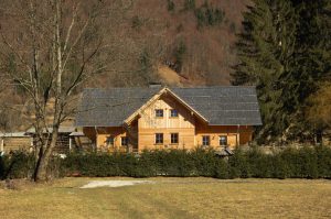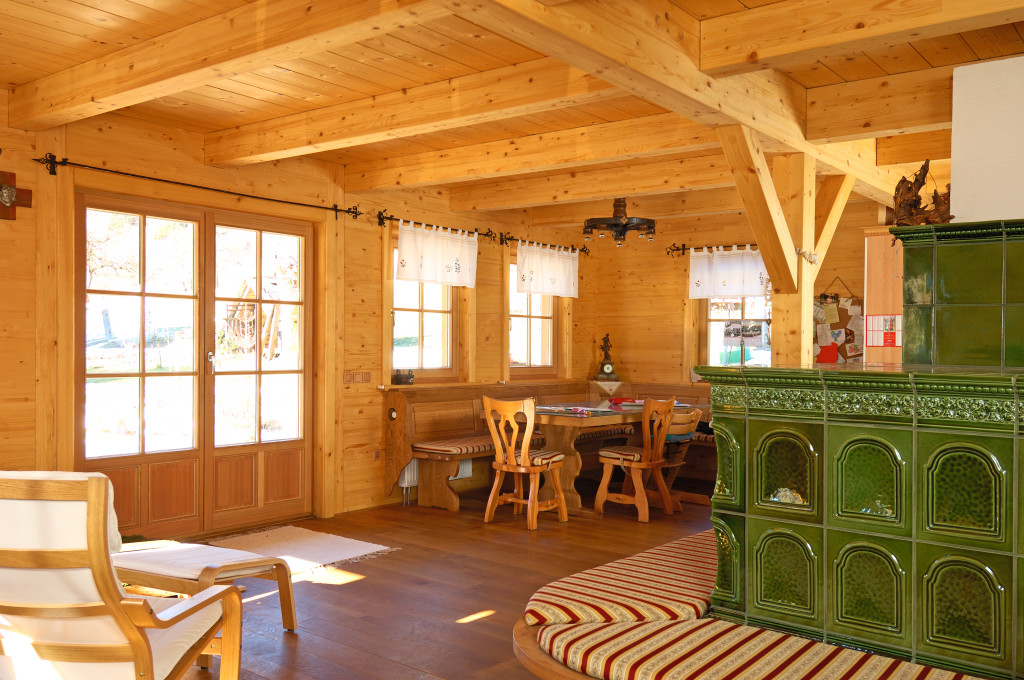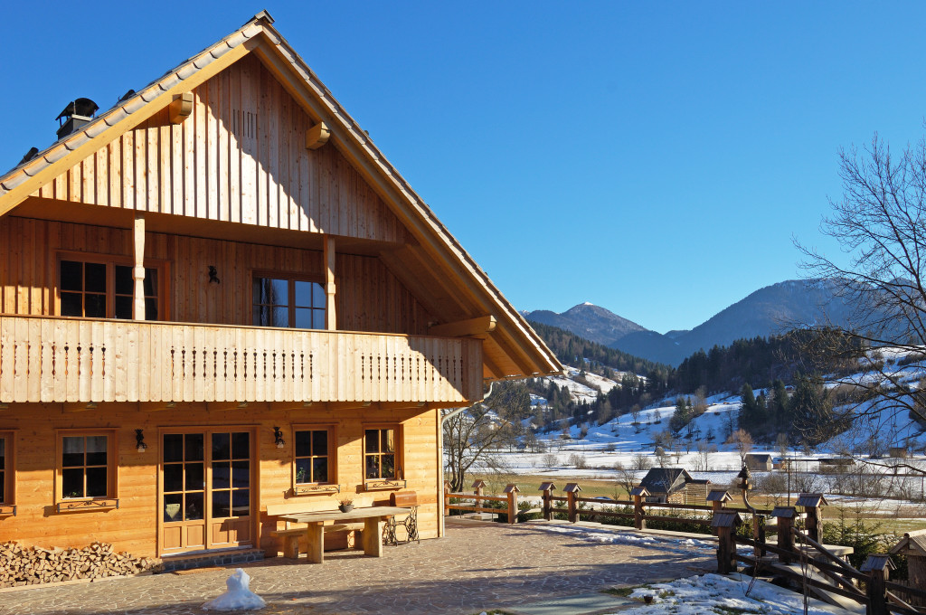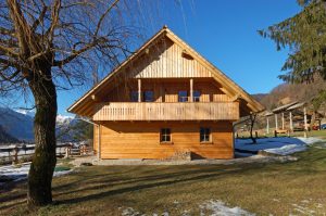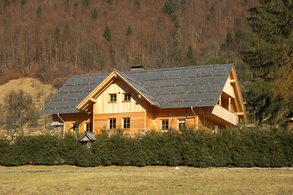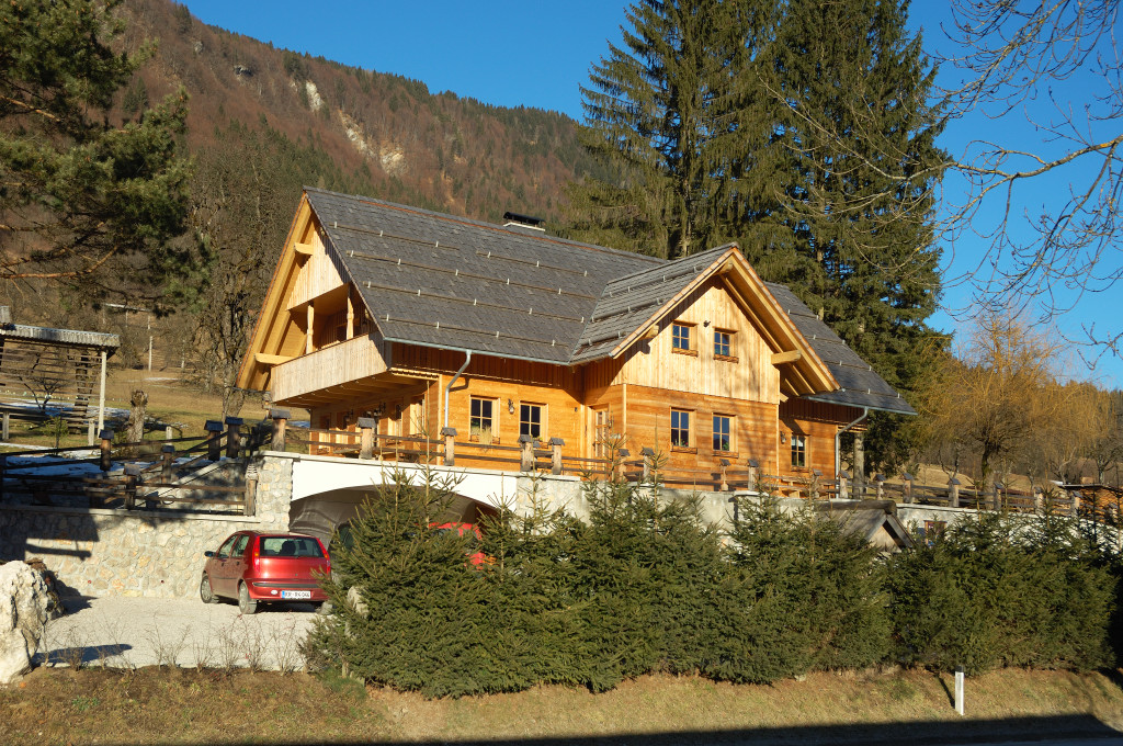 Objekt pristaje tipičnom alpskom prostoru. Odlikuje ga cjelovito oblikovanje u drvu: konstrukcija, fasada i krov koji je pokriven drvenom šindrom. Istaknut je drveni balkon, vanjski hodnik koji je svojim dizajnom tipičan element kuća u toj sredini. Višu razinu stanovanja i udobnosti dodatno oblikuje suživot različitih materijala u unutrašnjosti, gdje se drvo susreće s kaminom i lončanom peći, isto tako tradicionalnim elementima domova slovenske alpske sredine.