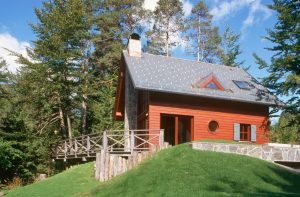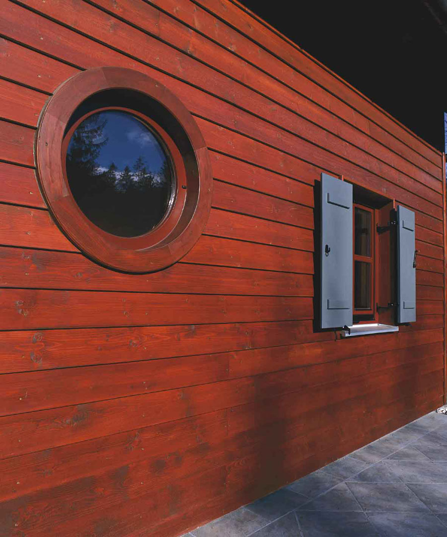 Kuća na moderan način usvaja tradicionalne karakteristike okoline. Označava je upadljivo crvena fasada od smreke. Razigrana kompozicija prozora i materijala usmjerava pogled iz unutrašnjosti kuće prema prirodnom ambijentu.