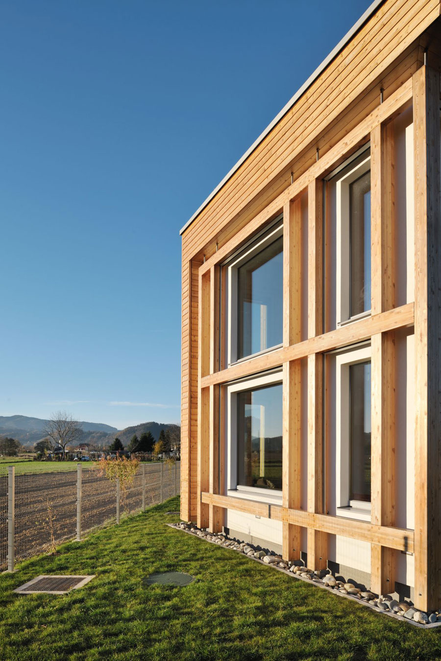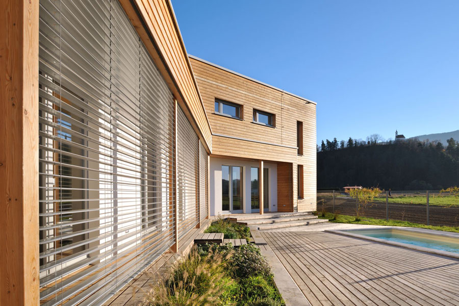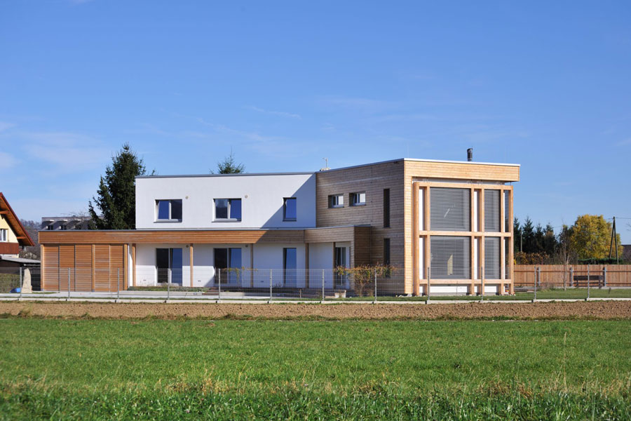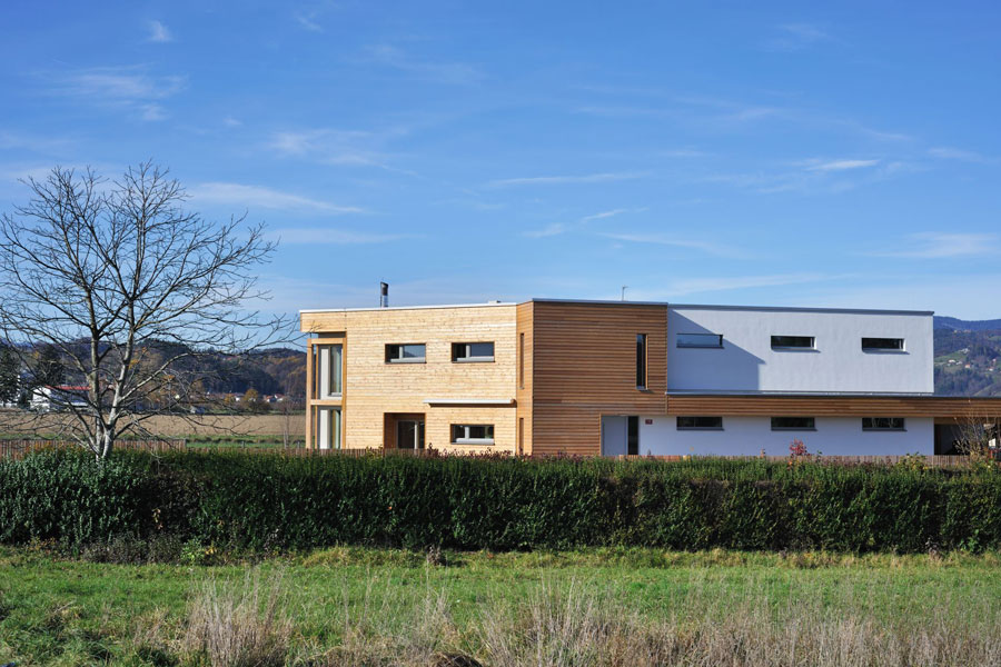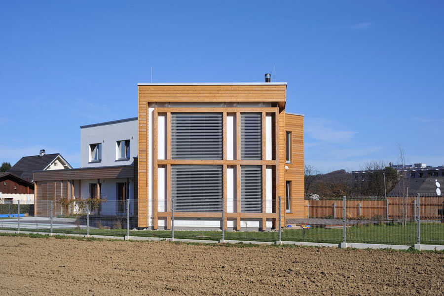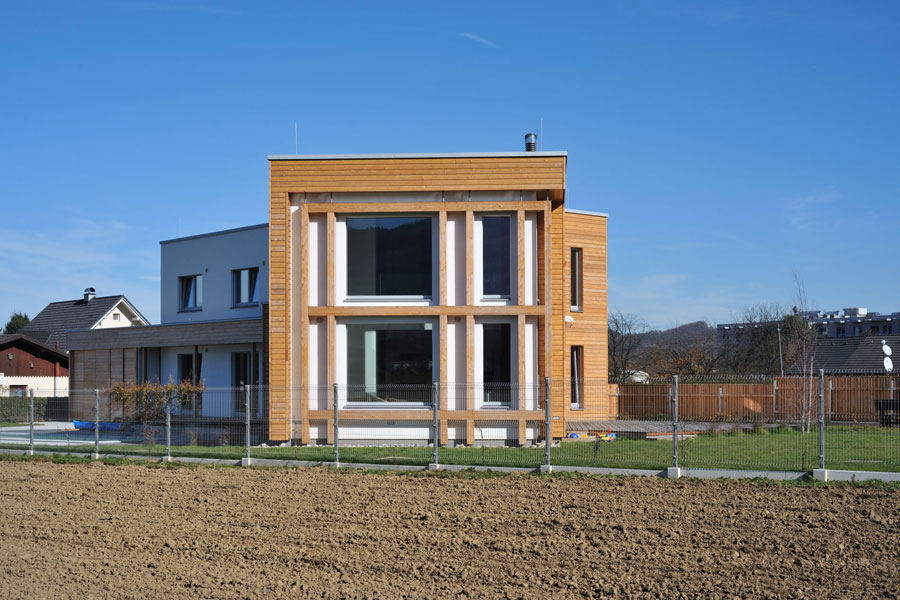 Obiteljska kuća bila je osmišljena s energetskom štedljivošću u vidu, zato je bila upotrebljena drvena masivna gradnja. Ekstenzivna zelena površina prekriva dio krova, u unutrašnjosti se dnevni