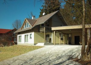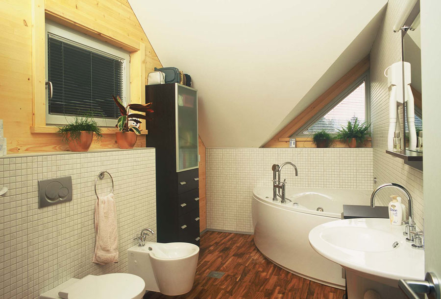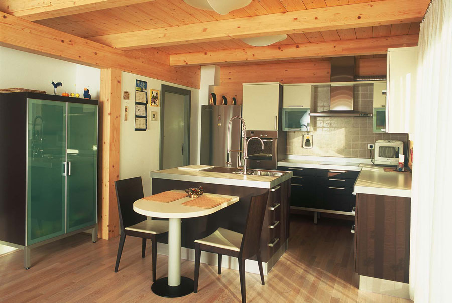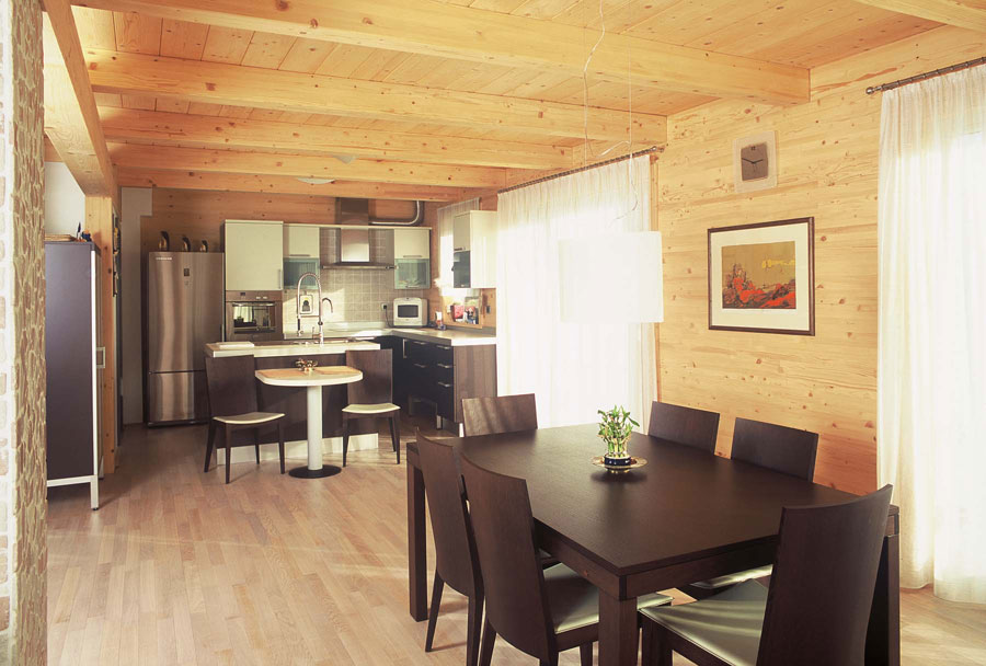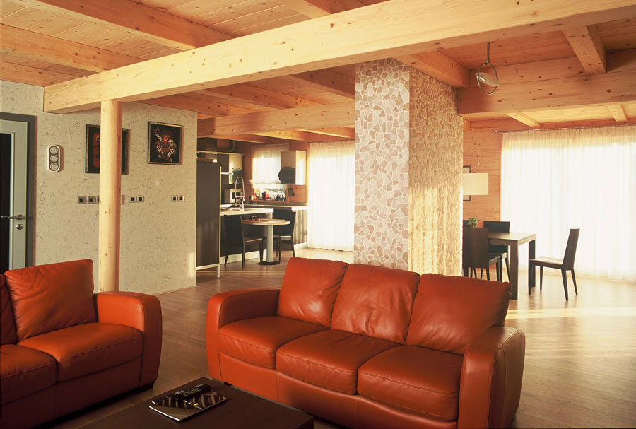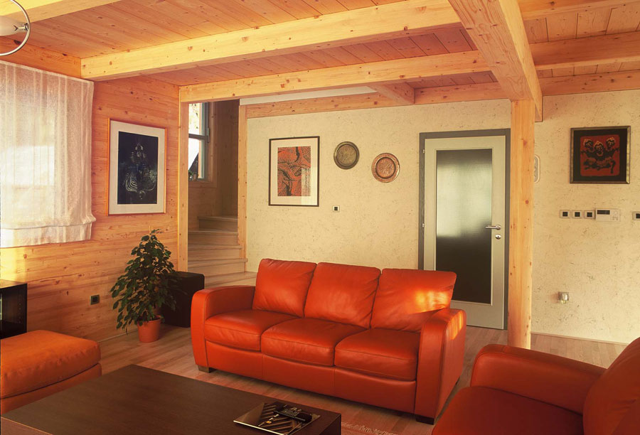 Kuća, koja je bila osmišljena kao niskoenergetski objekt, omogućava stanarima ugodno i udobno stanovanje. Unutra je u prostorima uređeno podno grijanje drvenih podova, unutarnje masivne stjene premazane su prirodnim pčelinjim voskom, a zanimljiva je i upotreba uljene tikovine u kupaonicama. Vanjski obod sastavljen je od klasične žbukane fasade u prizemlju i drvene smrekove fasade, zaštićene sivkastim lazurnim premazom, u mansardi.