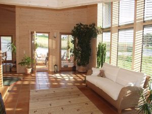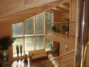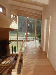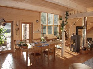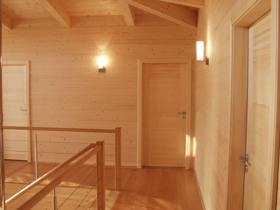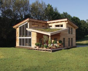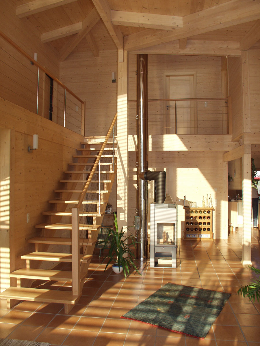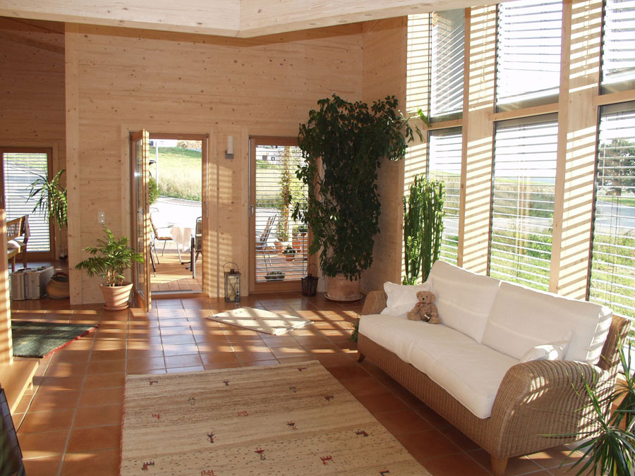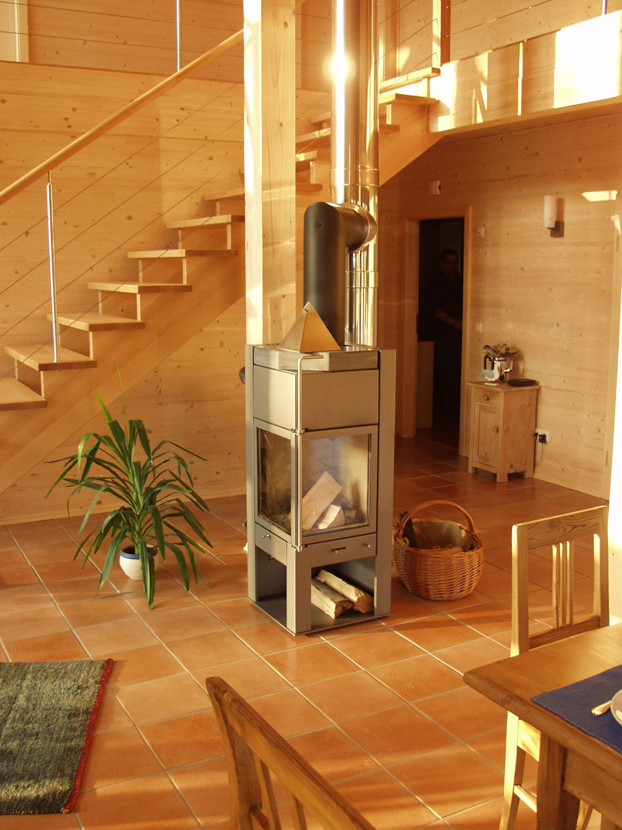 U okolici Münchena na šumskom proplanku izgrađen je maštovito zasnovan obiteljski objekt. Srce kuće predstavlja peć, koja je postavljena u sam centar otvorenog dvoetažnog prostora s galerijom. Prirodno osvjetljenje omogućeno je kroz velike staklene površine koje okružuju prostore za boravak. Kuća je tematski podijeljena na dva dijela, koje povezuje terasa sa zelenim krovom. Fasadna je obloga od ariša.